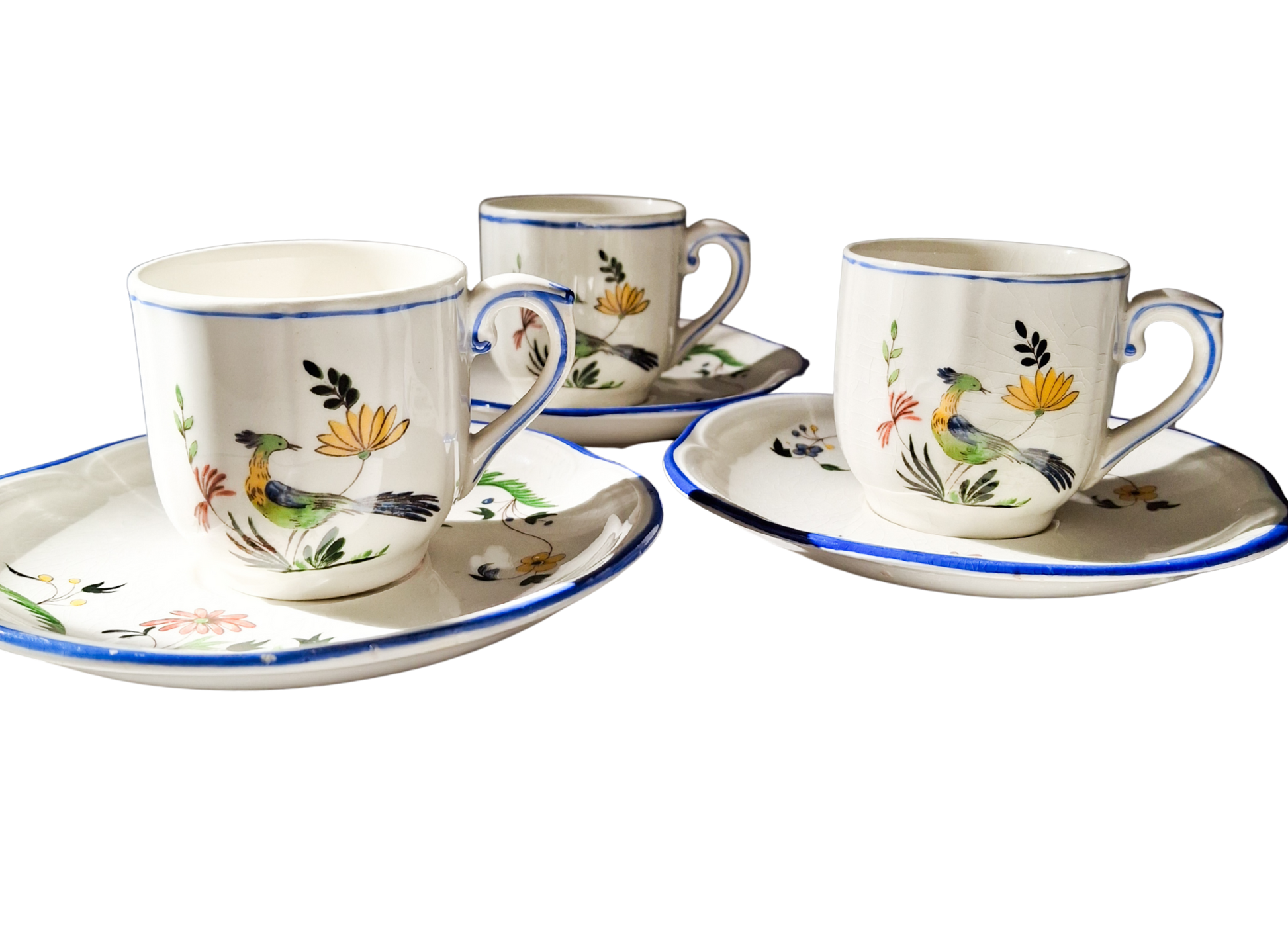 Beautiful vintage porcelain tea set for 3 from Gien, France. Delicate floral pattern "oiseaux de paradis", or birds of paradise. Ideal for afternoon tea or to elevate your morning coffee experience. The set is in very good vintage condition. There are a few nicks here and there on the saucers but they are barely visible.